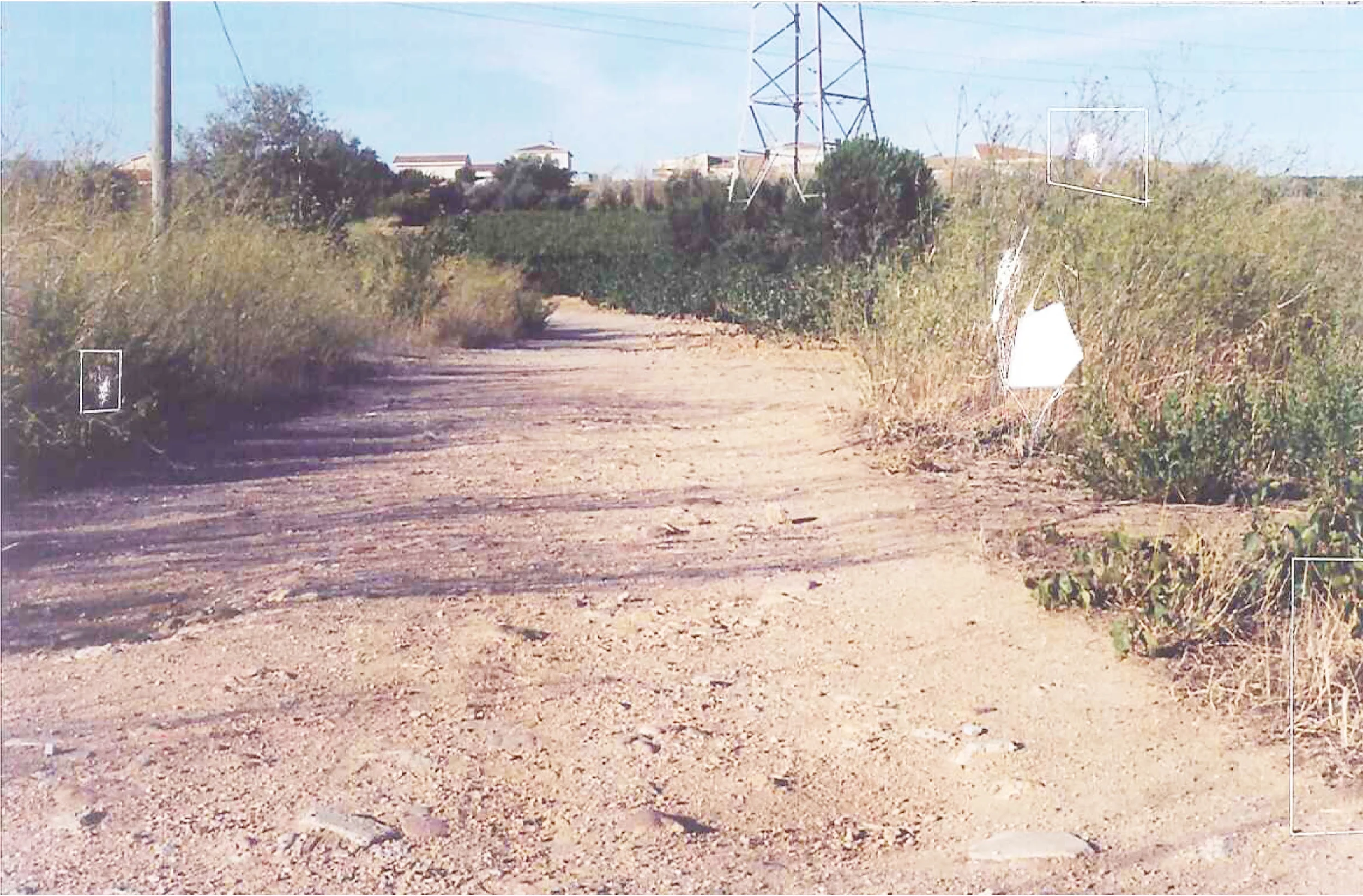A woman in a man's work shirt walks after a dog up the yellow road toward the Megacastillet.
